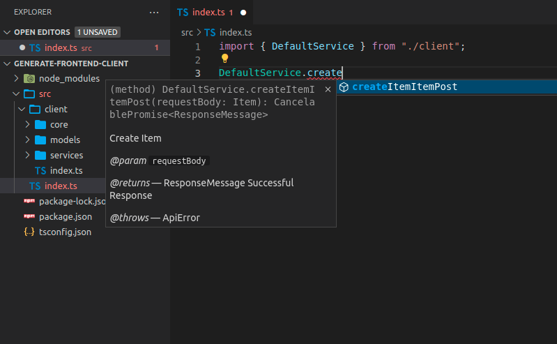 现在您可以导入并使用客户端代码,它可能看起来像这样,请注意,您可以为这些方法使用自动补全:
